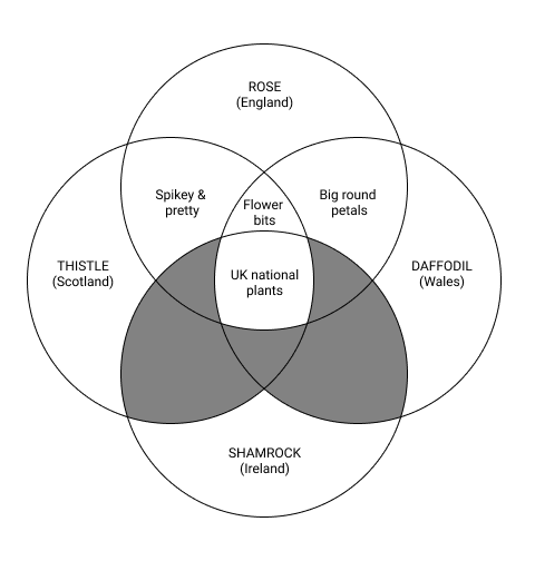 National plants. So England has the Rose, Scotland has the Thistle, Wales has the Daffodil, and Ireland turns up with a shamrock. Okay, so we have another odd-one-out here. Obviously the Rose and Thistle get along well because they are both pretty flowers, but they are also really spiky and can hurt you. Yes, it’s always about the England / Scotland drama. They also bloom similar times. Daffodil is a more peaceful flower, and blooms in spring. Now, although the Shamrock does technically flower, Ireland turns up with the leaf-based situation instead. Red roses, Blue Thistles, Yellow Daffodils - all prime colours. Green is tertiary… hmmm.